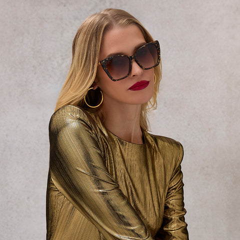 50% OFF Black Friday Sale diff eyewear featuring the gia square sunglasses with a glitter tortoise frame and brown gradient with gold flash lenses front view