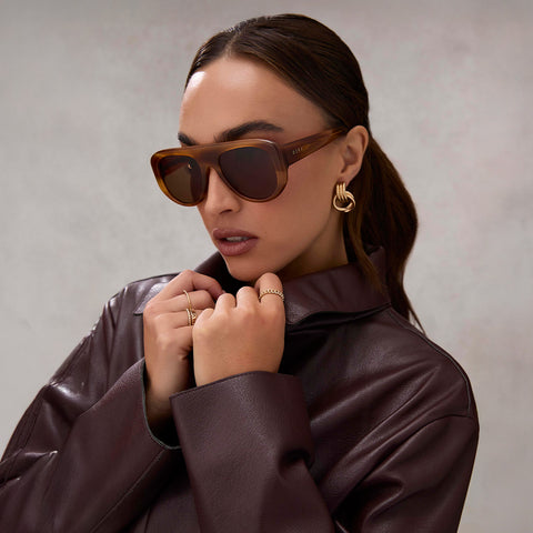 50% OFF Black Friday Sale diff eyewear featuring the tosca iii aviator sunglasses with a sequoia tortoise and gold trim frame and brown lenses front view